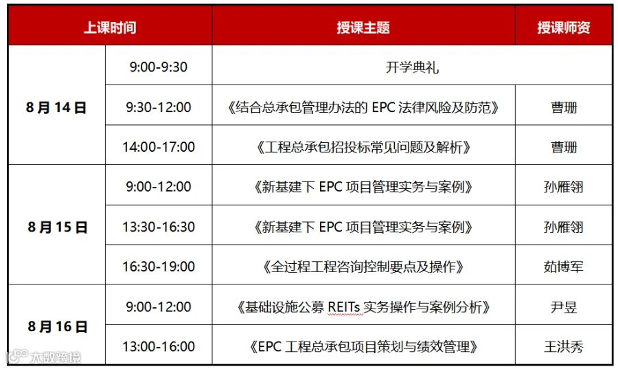 各位同学,您好!《新基建下EPC工程总承包与全过程工程咨询实战型高级研讨班》 第51期定于2020年8月14日-16日开课。请您提前联络教务老师,按时上课。