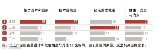 从维度积分来看,北京在“智力资本和创新”、“技术成熟度”、“健康、安全与治安”、“交通和城市规划”、“经济影响力”五个维度居前;上海在“区域重要城市”、“宜商环境”积分高居在第二;深圳在“交通和城市规划”与北京并列、并在“可持续发展与自然环境”和“宜商环境”领先居第三;广州在“区域重要城市”和“经济影响力”维度均超越深圳,但因在其他维度居后总积分低而屈居第四。