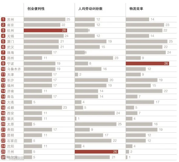 杭州在“创业便利性”变量排名第一,得益于杭州近年来大力支持创新创业。作为阿里集团的发源地与总部所在地,杭州已成为中国最重要的电子商务中心、国家高新技术产业基地和创新中心。