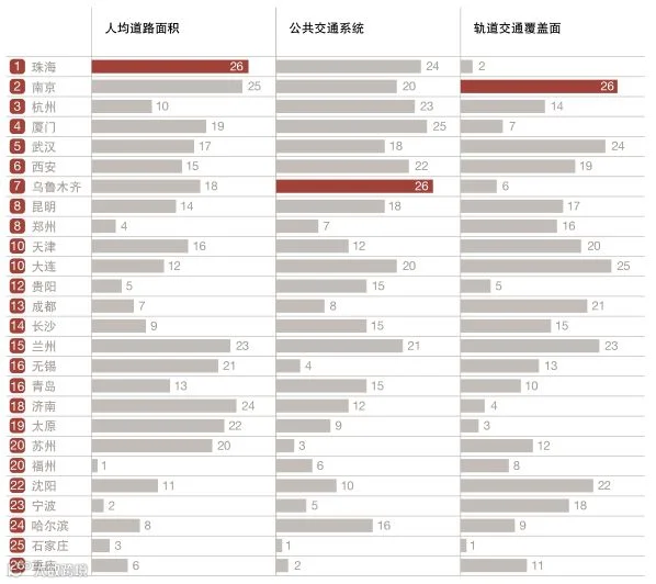 同时我们还注意到,武汉和西安的排名较去年都有所提高。这两个城市排名的上升同样得益于城市交通的高速发展。