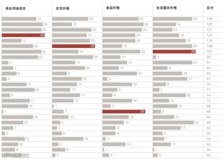 26座城市中,投资及生活成本最高的城市是杭州,特别是在公共交通和住宅价格变量上排位明显。珠海在维度排名中跟在杭州后面,成为26座城市中成本第二高的城市,缘于在“食品价格”和“生活服务价格”两个变量上位置突出。