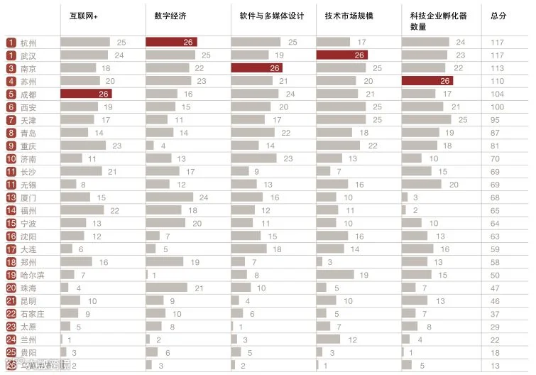“其中,排在前列的是南京、武汉、西安、杭州、天津。最后两个变量反映的是“双创”,创新和创业,排在前三位的都是杭州、成都、南京。这两个维度与“研究与开发水平”一起在某种程度上反映了大学以上教育的成果,它们既反映科技创新的局面,也构成了智力资本的重要要素。