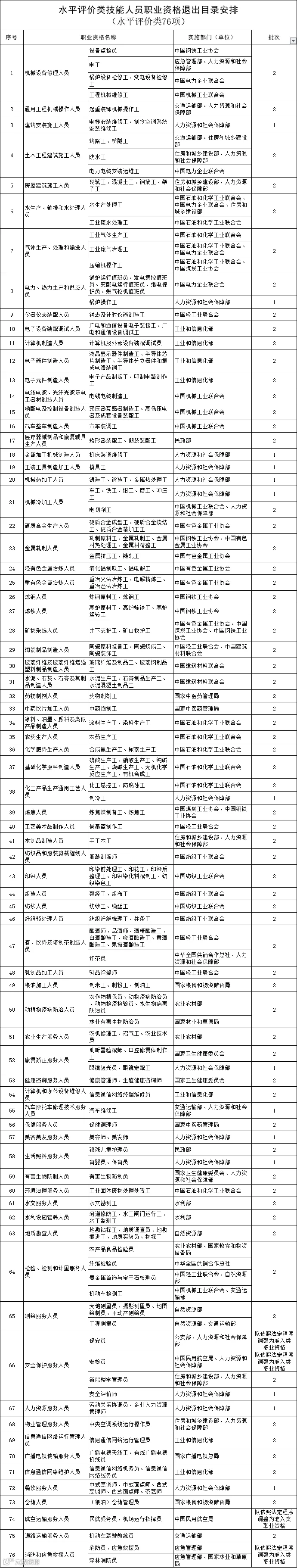 二、今年年底前,拟分批将水平评价类技能人员职业资格退出目录。人力资源社会保障部门和有关部门组织实施的14项职业资格(涉及29个职业)拟于9月30日前第一批退出。其他部门(单位)组织实施的66项职业资格(涉及156个职业)拟于12月31日前第二批退出。与公共安全、人身健康、生命财产安全等密切相关的职业(工种)拟依法调整为准入类职业资格。上述有关工作请于今年年底前完成(具体安排详见附件)。