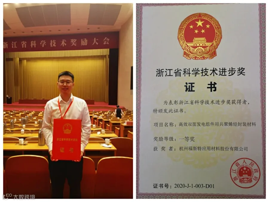6月15日下午,浙江省科学技术奖励大会在浙江省人民大会堂隆重举行,由杭州福斯特应用材料股份有限公司和浙江大学共同完成的 “高效双面发电组件用聚烯烃封装材料”项目荣获浙江省科技进步一等奖。