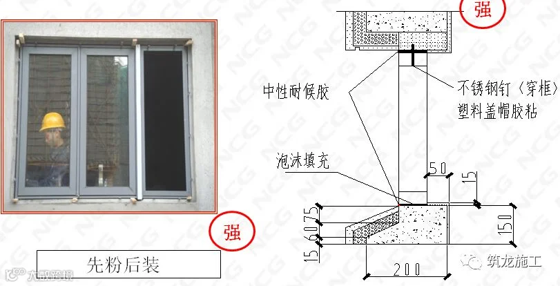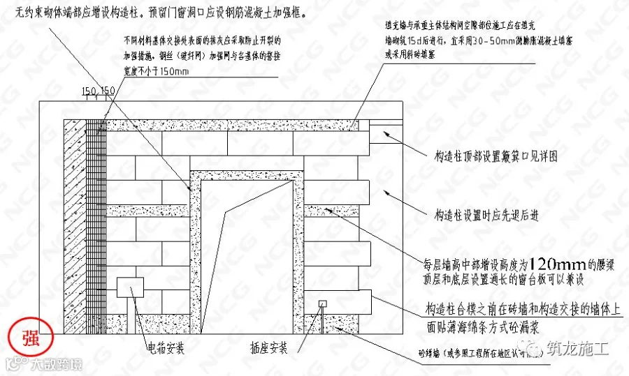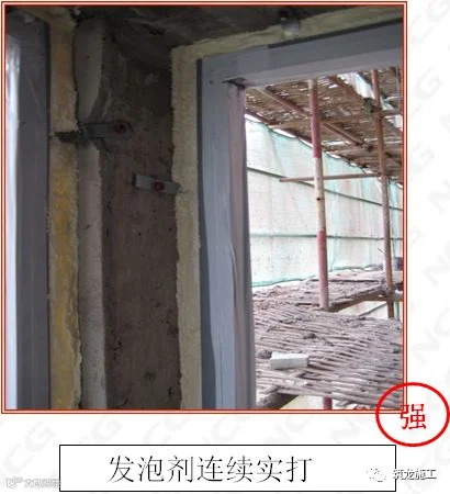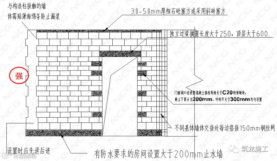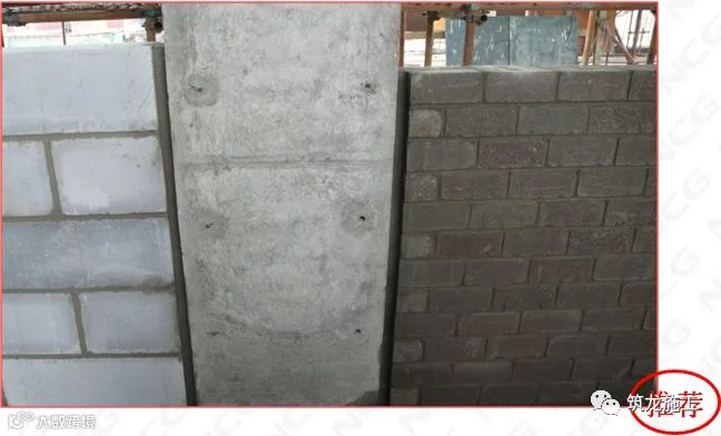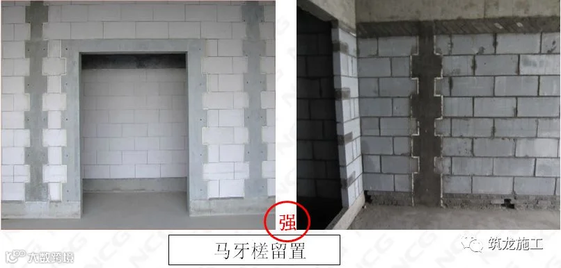 构造柱处的墙体应留置大马牙槎(300mm),并先退后进,上下垂直。马牙槎口边宜贴易撕的薄海绵条,防止构造柱浇筑时漏浆 。拆模后应及时清除海绵条。