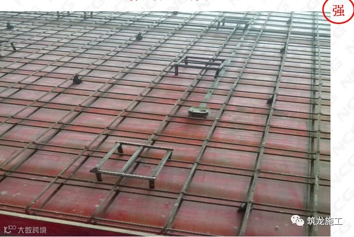 (1)板面钢筋与柱、剪力墙等竖向构件钢筋交叉处必须加设防止砼浇筑时的竖向钢筋位移的固定筋(箍筋),并点焊牢固。