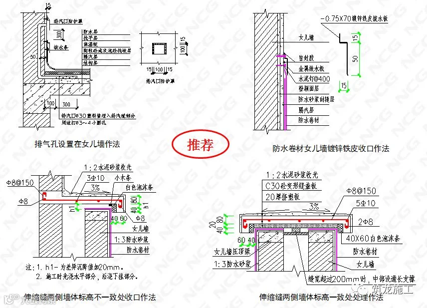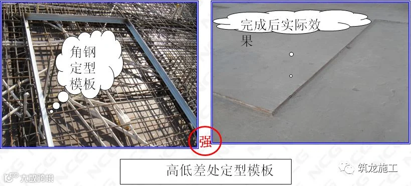 卫生间等有高低差的部位、有高低差的房间(室外与室内,厨卫间与房间等)应在高低差处采用方钢制作定型模板,或采用3号角钢与钢筋焊接,确保高低差处的边角整齐(见图)