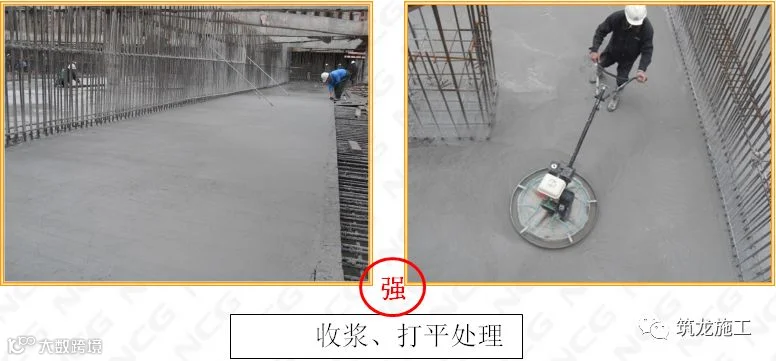 楼面混凝土初凝前应派专人从节点(柱、剪力墙、楼梯等周边)开始向中间用1.5~3.0m长的铝合金刮尺抽平、收面,柱和剪力墙根部为防止模板下口漏浆应加强标高控制 ;初凝后终凝前进行二次收光,用铁抹收平压实(如出现裂缝垂直裂缝方向),再用木抹打平;或者采用电动磨光机进行收浆、打平处理。。
