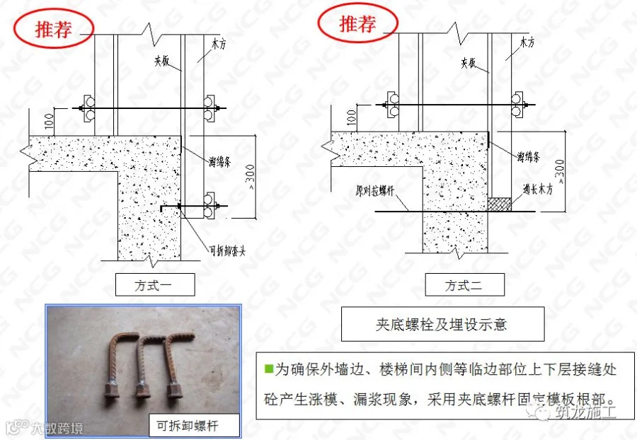 墙柱施工缝部位在模板上沿钉通长木条留设20*10mm通长槽口,上部支模时模板下送30cm支模及固定限位。