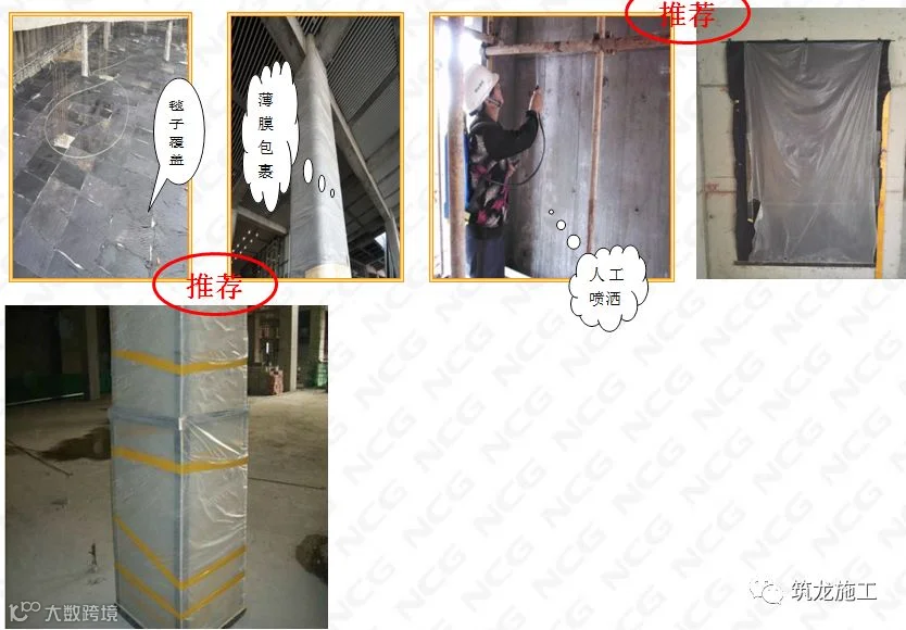 应编制混凝土专项养护方案,设专人负责,定时查看、定时保养。应优先采用涂膜养护或薄膜养护,(水平构件宜采用薄膜等覆盖,竖向墙板、柱等混凝土构件,宜采用薄膜包裹或喷涂混凝土养护液等方法进行保湿养护)。