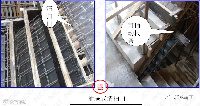 楼梯施工缝处模板预留抽屉式清扫口 。