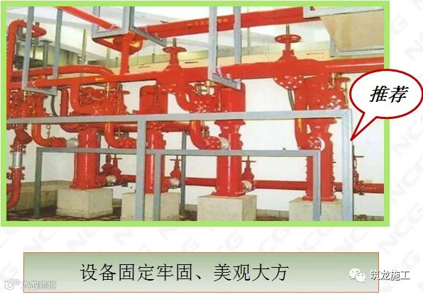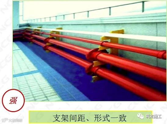 成排管道支架布置合理、管道安装平直、牢固,抱箍的形式一致。