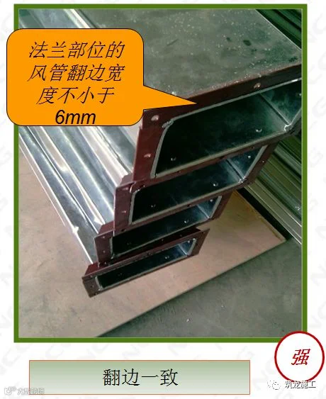金属法兰连接风管的制作,翻边应平整、紧贴法兰,其宽度应一致,咬缝与四角处不应有开裂与孔洞。