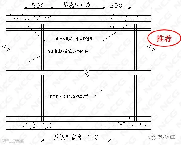 后浇带的支撑应采用分离式独立(快拆)体系,严禁先拆后顶。避免周边模板拆除时对该部位产生影响,从而消除了后浇带两侧结构悬臂造成混凝土开裂等现象发生。