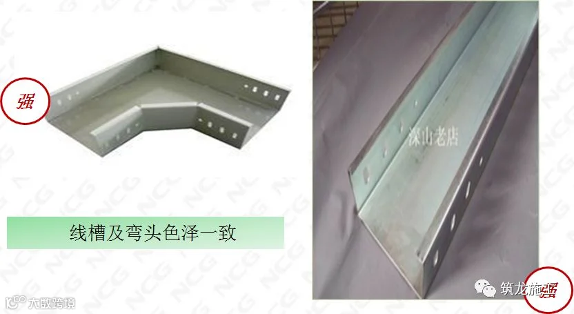 电缆线槽应部件齐全,表面光滑、不变形;钢制桥架涂层完整,无锈蚀。线槽镀层完整,色泽一致,零配件均为工厂制作。