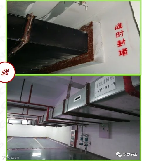 1、风管穿过防火、防爆墙时应预埋防护套管,其钢板厚度不应小于1.6mm,风管本体与防护套管之间应使用防火填料填塞严密,两端平整。