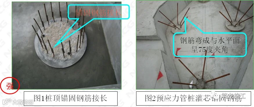 (3)桩顶纵向主筋应调直,锚入承台长度应符合设计要求,当长度不足时,应双面焊接接长(见图1)。预应力管桩灌芯混凝土的锚固钢筋应与水平面成75度夹角或按照设计要求(见图2)。