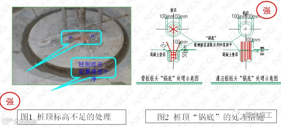 当桩顶标高略低于设计标高时,应将桩侧做成 “锅底”状,侧边用水泥砂浆粉刷,确保有效桩头伸出锅底大于5cm,(见图1、2)。