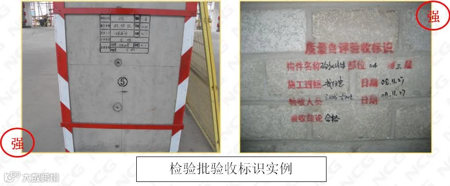 砌体、混凝土等实体工程应按检验批进行验收,并在相应构件明显部位设置验收标识,标明施工人员、验收人员、验收日期及验收情况(参加人员、时间、结论)。