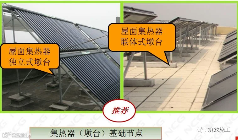 集热器支架墩台可做成独立式,也可根据集热器数量及布置统一制作联体式墩台,墩台与支架连接部位应牢固可靠。当采用整体墩台时应考虑防水的要求,避免屋面雨水滞留。