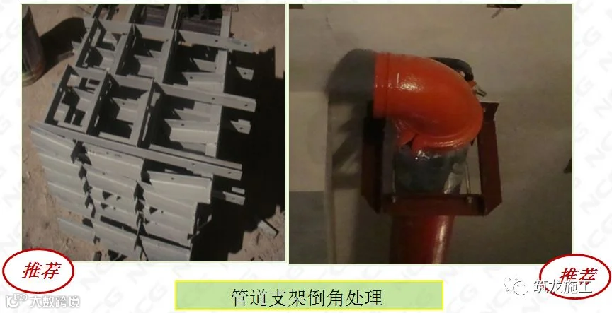 地下室或楼层过道内设备管线过多时,应采用组合式支架;门字架拐角处应进行倒角处理。