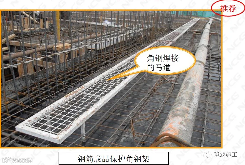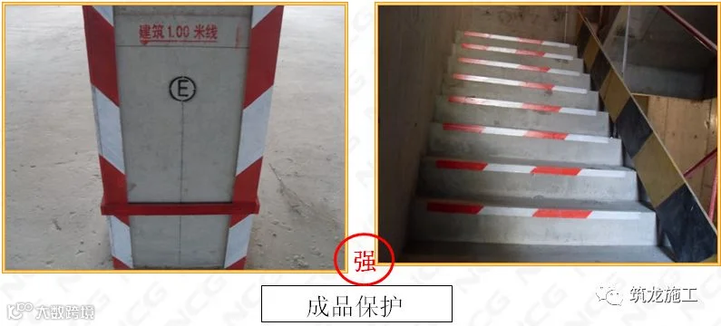 施工通道处的竖向构件阳角、楼梯踏步部位应采用模板条钉成保护角进行保护。水平面在终凝前不得踩踏边退边抹,避免留下脚印 。