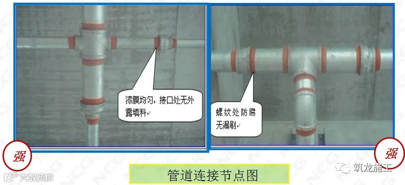 螺纹联接管道安装后的管螺纹根部应有2~3扣的外露螺纹,多余的麻丝应清理干净并做防腐处理。罗纹清洁无损伤,螺纹处防腐无漏涂。