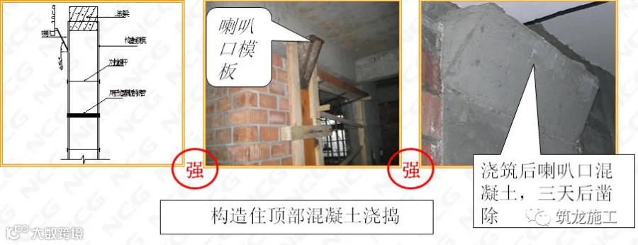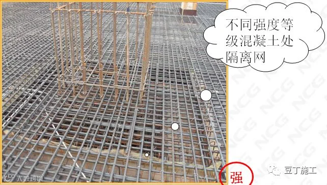 为杜绝梁、柱节点处混凝土 “夹层饼干”产生,确保混凝土结构和外观质量,在梁柱节点四周设置镀锌钢丝网进行隔离,并先对高强度等级的柱混凝土进行浇筑 。