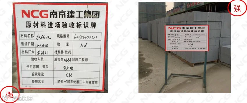 钢筋、水泥、砖(砌块)、砂石等原材料进场后应分类堆放整齐,按批进行验收。现场所有原材料及半成品、成品、周转材料均应设置标识牌,标识牌应标明进场时间和数量、材料名称和规格型号、验收人员、验收结论(合格、不合格)。