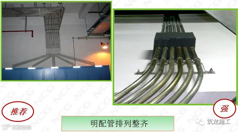 3、明配的导管应排列整齐,固定点间距均匀,安装牢固;在终端、弯头中点、箱、盒、柜等边缘的距离150~300mm范围内应设有管卡。
