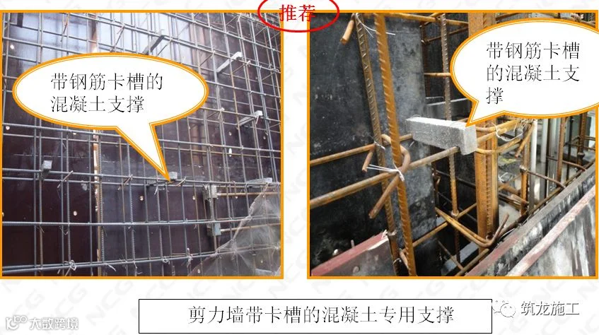 3、剪力墙采用定型的带卡槽的混凝土支撑,控制钢筋保护层厚度和模板的空间尺寸 。