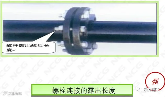 连接法兰的螺栓,直径和长度应符合标准,拧紧后,突出螺母的长度不应大于螺杆直径的1/2,以露出2-3丝扣长度为宜。