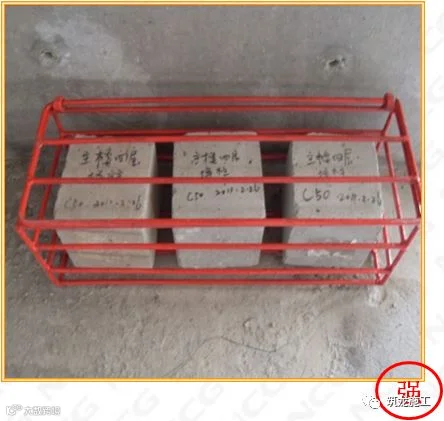 (2)同条件试块脱膜后应装在钢筋焊接笼中(左上图),放在相应的楼层位置养护。试块标识清晰规范,标识应明确试块代表的部位。