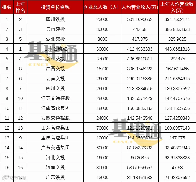 省级交通投资企业人均营业收入都较高,排名变化不是很大。