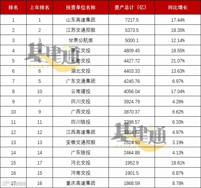 总资产超过5000亿元的有3家企业,且连续两年前3名都是这3家企业,分别是山东高速集团、江苏交通控股、甘肃公航旅。