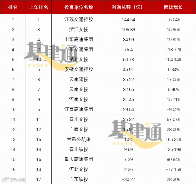 同利润总额一样,名次上升最快的是湖北交投,从第10名上升到第5名。
