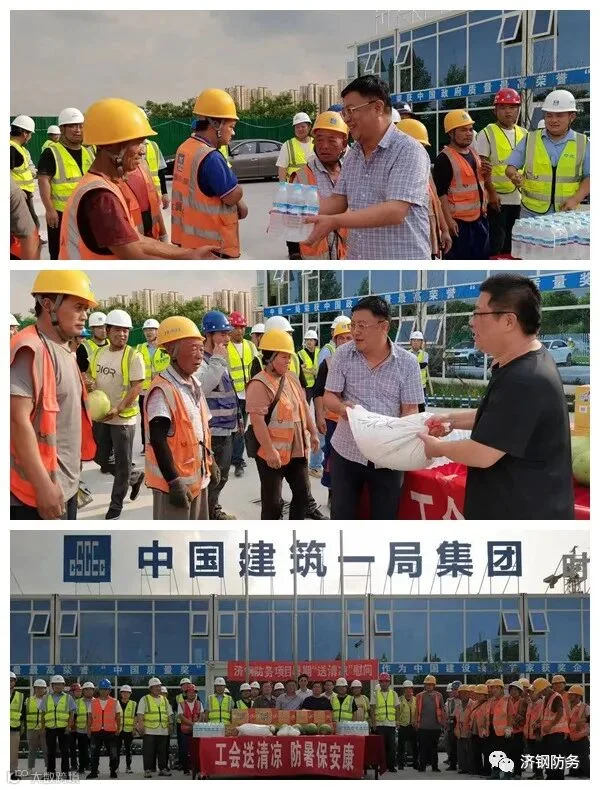 在济钢防务空天产业基地二期项目现场,盛桂军副总经理为相关方工人送去了防暑慰问品,向不畏酷暑奋战在项目一线的同志表示诚挚的问候。他叮嘱大家注意防暑降温,并要求落实好安全生产保护措施,在安全的前提下,全力推进园区项目建设。