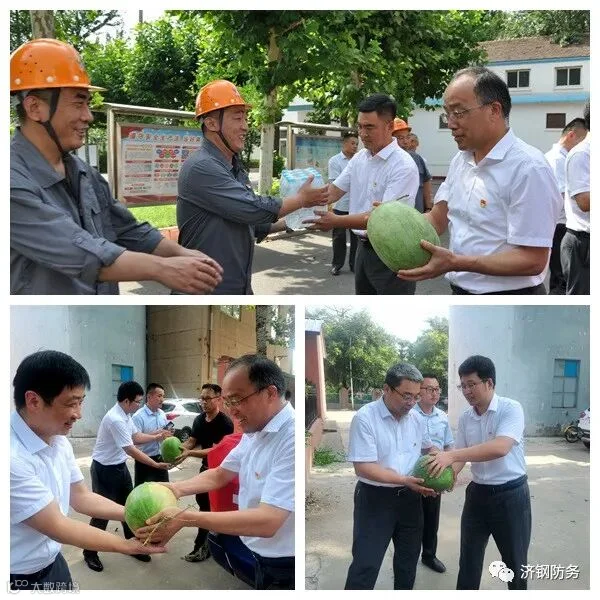 7月份以来,持续的高温天气,考验着奋战在各工作岗位上的员工们,同时也牵动着济钢防务公司领导的心。为做好高温酷暑期间的防暑降温工作,7月14日,济钢防务开展了送清凉慰问活动,济钢防务总经理郭强,副总经理盛桂军、丁双旗、姚君代表公司领导班子,为奋战在一线的员工送来了“清凉”,把防暑降温物资送到了生产一线,把关怀送到了员工心坎。