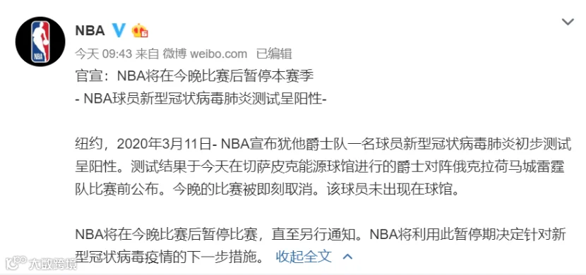同时,今天NBA也出现大危机。继NBA宣布空场比赛措施后,爵士球员戈贝尔确诊感染新冠病毒,成为NBA第一例确诊患者。