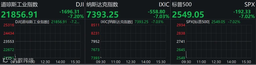 今日美股开盘后仅5分钟,标普500指数跌幅扩大至7%,触发本周第二次熔断,美股暂停交易15分钟,这也是美股史上第三次熔断!道指熔断前跌1696.31点报21856.91点,纳指跌7.03%报7393.25点。