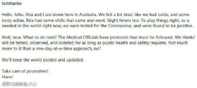 汤姆·汉克斯发文回忆,“我们感到感冒一般的疲惫、身体疼痛”,然后去做了检测,确诊为新冠阳性。他表示会遵从指示隔离,确保公众安全,未来他们会一步一步来,并提醒大家注意身体。