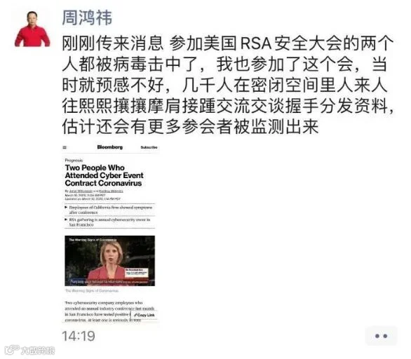 同时,根据媒体的报道,近日美国RSA安全大会也出现两人被确诊新冠。3月11日,周鸿祎在朋友圈曝自己也参加了该会。他表示,会场几千人在密闭空间人来人往,自己并没有戴口罩。他当时就预感不好,估计还会有更多确诊病例出现。