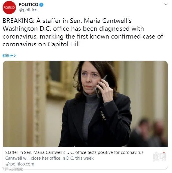 同时,美国国会发现首例确诊新冠肺炎患者。据美国Politico网站11日报道,美国参议员玛利亚·坎特维尔位于华盛顿办公室的一名工作人员确诊感染新型冠状病毒肺炎,这是美国国会首次发现确诊病例。坎特维尔本周将关闭其华盛顿的办公室,工作人员将远程办公。此外她要求对其他员工进行病毒检测。