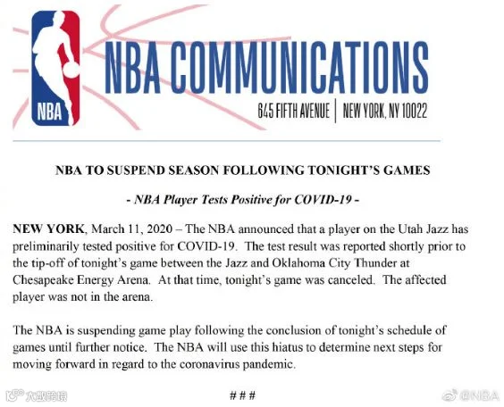 NBA官方随后紧急宣布:由于一名爵士球员在新冠检测中呈阳性,今晚雷霆和爵士的比赛被取消。官方将在今晚的比赛之后暂停本赛季,直到另行通知。NBA将利用这一空档来决定下一步如何应对新冠病毒的流行。