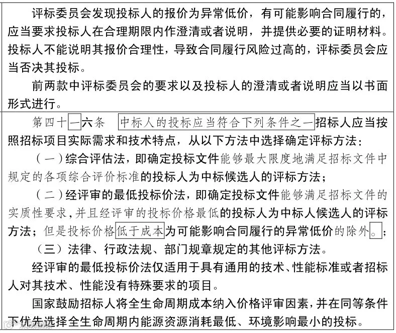 (二)经评审的最低投标价法,即投标文件能够满足招标文件的实质性要求,并且经评审的投标价格最低的投标人为中标人候选人的评标办法;但是投标价格低于成本可能影响合同履行的异常低价的除外。☞点击进入建筑业要闻