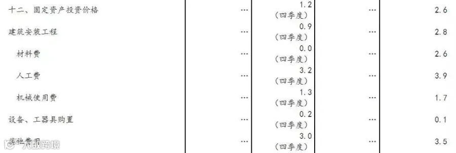 在固定资产投资价格方面,建筑安装工程2019年同比增长2.8%,其中材料费、人工费、机械使用费分别同比增长2.6%、3.9%、1.7%。
