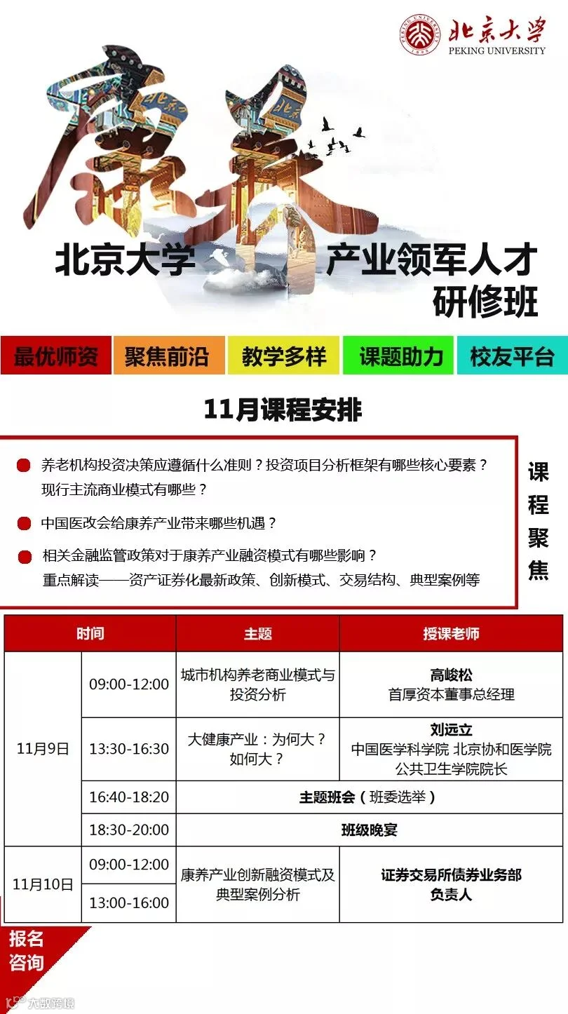 在我国,越来越多的城市,将康养作为经济转型发展的重要方向,在这样的背景下,北京大学举办北京大学康养产业领军人才研修班,构建从行业政策、商业模式、顶层策划、投融资、运营、品牌营销等系统课程体系,致力于探索产业全方位服务为一体的康养+多产业运营模式与解决方案,汇集产业相关主管领导、权威行业专家、领军企业家、资本大家、研究学者等,助力发展引领中国康养产业发展的主力部队。