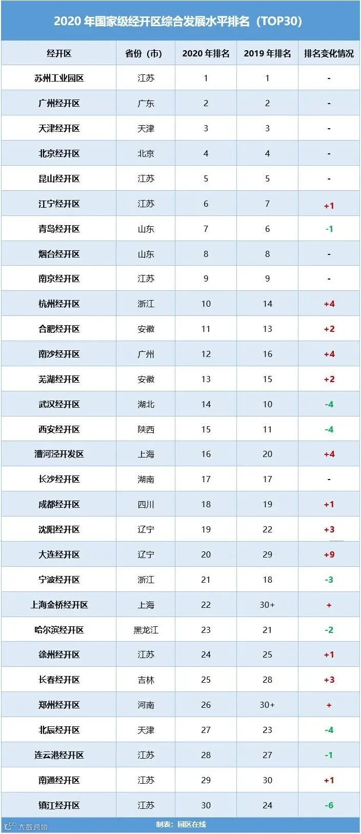 本届榜单上的30家园区,基本都是历年Top30榜的常客,与2019年相比,只有两张新面孔(上海金桥经开区、郑州经开区),其中上海金桥经开区曾出现在2018年的Top30榜单中,本次算是时隔一年再次回归;此外,综合排名Top30的园区与其他单项冠军(如吸收利用外资前10名、出口总额前10名)的重合率也相对较高。