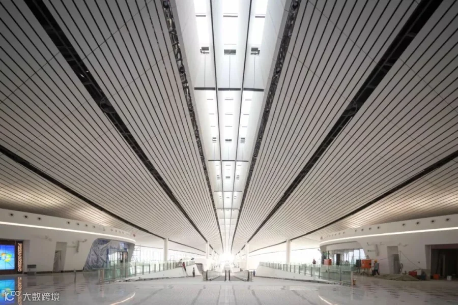 从高空俯览整个北京大兴国际机场,它就像是一只庞大的凤凰;以航站楼为中心,分别向东北,东南,中南,西南,西北;五个方向伸出了五条外形像翅膀一样的巨型走廊。