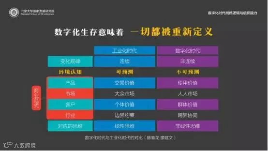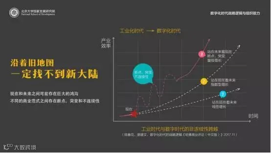 过去,产业效率是线性增长,之后速度加快变为指数型增长,都还有规律可循。但今天,从工业时代向数字时代转换最大的变化,就是从连续性思维转向非连续性思维。这就需要组织具有跨越能力。
